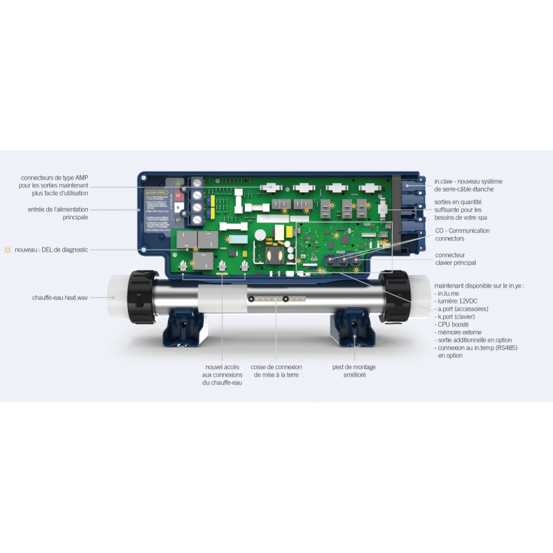 Le in.ye5 prend en charge 5 sorties configurables, un chauffe-eau de 4 kW et une lumière 12V. Idéal pour les spas d’entrée de gamme et de milieu de gamme.